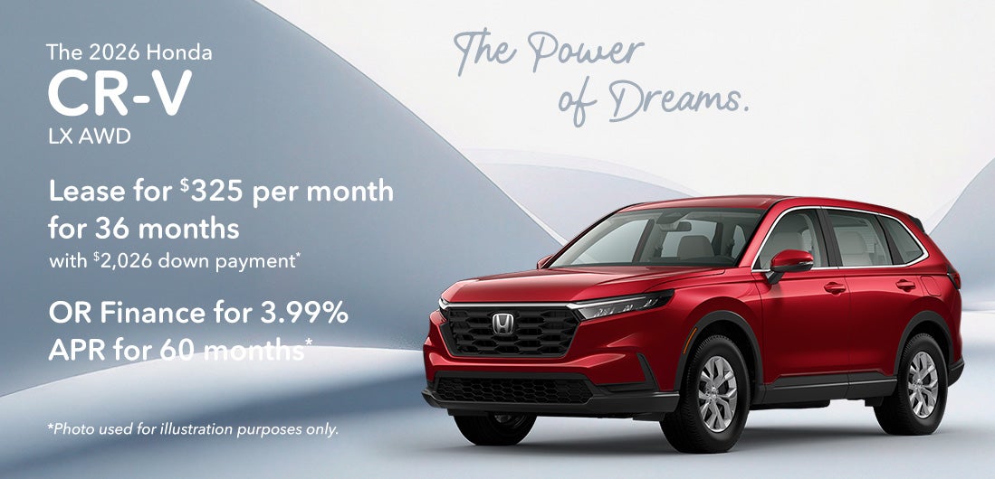 *2026 Honda CR-V LX All Wheel Drive $33,870 MSRP. Model Code RS4H2TEW. VIN 2HKRS4H27TH469835. Stock#262539. 4 cylinder engine, CVT transmission, Sport Utility. *Lease offer $325 per month for 36 Months, 30,000 miles. Excess mileage fee of $0.20 per mile over, $595 acquisition fee, $0 security deposit. Must have 2011 or newer loyalty or conquest to qualify. $2,026 down payment, plus $325 first payment, tax, title and dmv. $11,700 total payments for lease term. With approved credit through Honda Financial Services with tier 1 approval (720+ beacon score). Lessee responsible for maintenance and excess wear & tear. **APR finance offer 3.99% for 60 months with approved credit. $18.41 per month, per $1,000 financed. Not all will qualify. Must take delivery from retail stock. Prior sales excluded. Offer subject to change. Offer expires on 03/31/2026.