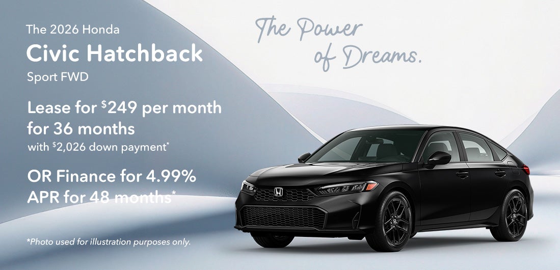 *2026 Honda Civic Hatchback Sport Front Wheel Drive $29,445 MSRP. Model Code FL2H8TEW. VIN 19XFL2H83TE010041. Stock#262354. 4 cylinder engine, CVT transmission, Hatchback. *Lease offer $249 per month for 36 Months, 30,000 miles. Excess mileage fee of $0.15 per mile over, $595 acquisition fee, $0 security deposit. Must have 2011 or newer loyalty or conquest to qualify. $2,026 down payment, plus $249 first payment, tax, title and dmv. $8,964 total payments for lease term. With approved credit through Honda Financial Services with tier 1 approval (720+ beacon score). Lessee responsible for maintenance and excess wear & tear. **APR finance offer 4.99% for 48 months with approved credit. $23.02 per month, per $1,000 financed. Not all will qualify. Must take delivery from retail stock. Prior sales excluded. Offer subject to change. Offer expires on 03/31/2026.