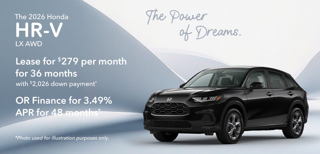 *2026 Honda HR-V LX All Wheel Drive $29,605 MSRP. Model Code RZ2H3TEW. VIN 3CZRZ2H31TM743673. Stock#262309. 4 cylinder engine, CVT transmission, Sport Utility. *Lease offer $279 per month for 36 Months, 30,000 miles. Excess mileage fee of $0.15 per mile over, $595 acquisition fee, $0 security deposit. Must have 2011 or newer loyalty or conquest to qualify. $2,026 down payment, plus $279 first payment, tax, title and dmv. $10,044 total payments for lease term. With approved credit through Honda Financial Services with tier 1 approval (720+ beacon score). Lessee responsible for maintenance and excess wear & tear. **APR finance offer 3.49% for 48 months with approved credit. $22.35 per month, per $1,000 financed. Not all will qualify. Must take delivery from retail stock. Prior sales excluded. Offer subject to change. Offer expires on 03/31/2026.