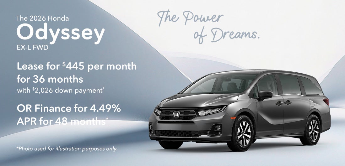 *2026 Honda Odyssey EX-L Front Wheel Drive $44,290 MSRP. Model Code RL6H6TJNW. VIN 5FNRL6H69TB045342. Stock#262526. 6 cylinder engine, Automatic transmission, Passenger Van. *Lease offer $445 per month for 36 Months, 30,000 miles. Excess mileage fee of $0.20 per mile over, $595 acquisition fee, $0 security deposit. Must have 2011 or newer loyalty or conquest to qualify. $2,026 down payment, plus $445 first payment, tax, title and dmv. $16,020 total payments for lease term. With approved credit through Honda Financial Services with tier 1 approval (720+ beacon score). Lessee responsible for maintenance and excess wear & tear. **APR finance offer 4.49% for 48 months with approved credit. $22.80 per month, per $1,000 financed. Not all will qualify. Must take delivery from retail stock. Prior sales excluded. Offer subject to change. Offer expires on 03/31/2026.