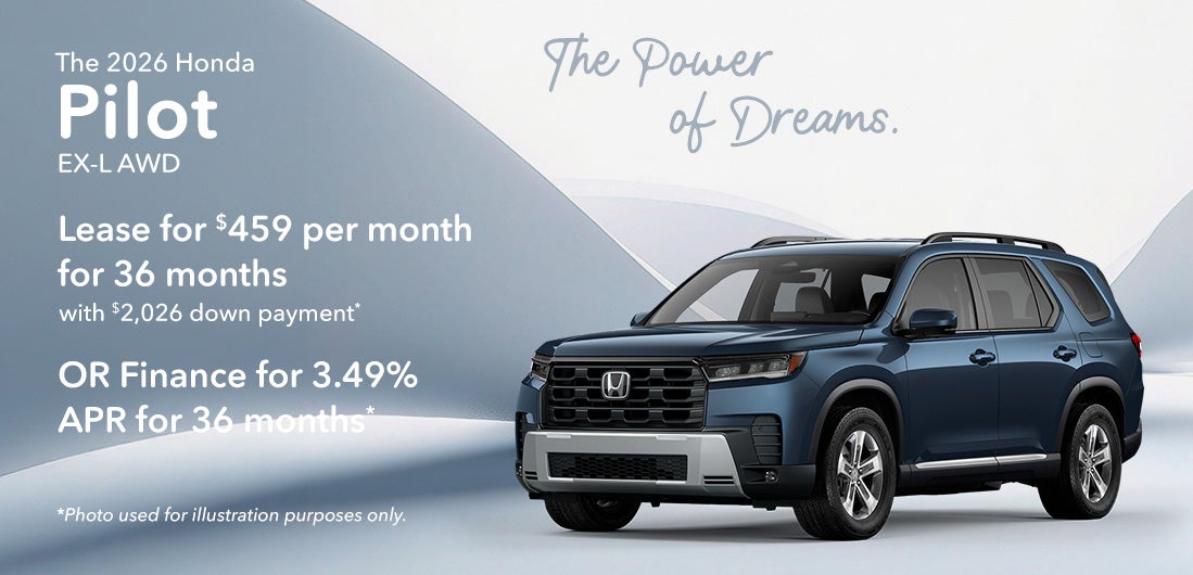 *2026 Honda Pilot EX-L All Wheel Drive $48,545 MSRP. Model Code YG1H4TENW. VIN 5FNYG1H45TB010038. Stock#262496. 6 cylinder engine, Automatic transmission, Sport Utility. *Lease offer $459 per month for 36 Months, 30,000 miles. Excess mileage fee of $0.20 per mile over, $595 acquisition fee, $0 security deposit. Must have 2011 or newer loyalty or conquest to qualify. $2,026 down payment, plus $459 first payment, tax, title and dmv. $16,524 total payments for lease term. With approved credit through Honda Financial Services with tier 1 approval (720+ beacon score). Lessee responsible for maintenance and excess wear & tear. **APR finance offer 3.49% for 36 months with approved credit. $29.30 per month, per $1,000 financed. Not all will qualify. Must take delivery from retail stock. Prior sales excluded. Offer subject to change. Offer expires on 03/31/2026.