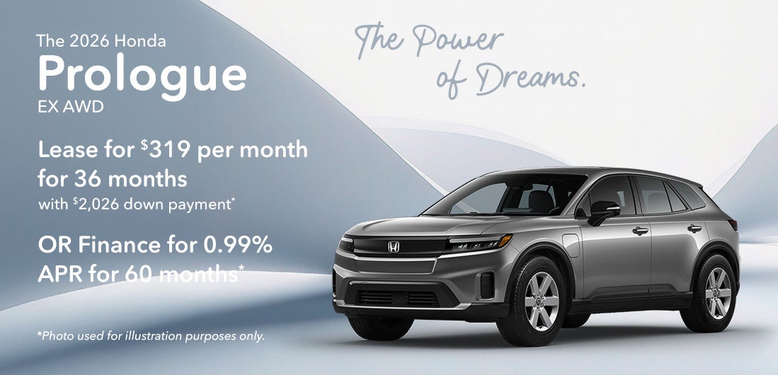 *2026 Honda Prologue EX All Wheel Drive $50,995 MSRP. Model Code 3B4H2TEW. VIN 3GPKHVRJ9TS501362. Stock#262337. 0 cylinder engine, Automatic transmission, Sport Utility. *Lease offer $319 per month for 36 Months, 30,000 miles. Excess mileage fee of $0.20 per mile over, $595 acquisition fee, $0 security deposit. Must have 2011 or newer loyalty or conquest to qualify. $2,026 down payment, plus $319 first payment, tax, title and dmv. $11,484 total payments for lease term. With approved credit through Honda Financial Services with tier 1 approval (720+ beacon score). Lessee responsible for maintenance and excess wear & tear. **APR finance offer 0.99% for 60 months with approved credit. $17.09 per month, per $1,000 financed. Not all will qualify. Must take delivery from retail stock. Prior sales excluded. Offer subject to change. Offer expires on 03/31/2026.