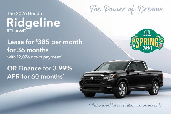 2026 Honda Ridgeline RTL All Wheel Drive $45,090 MSRP. Model Code YK3F5TJNW. VIN 5FPYK3F59TB023470. Stock#262590. 6 cylinder engine, Automatic transmission, Crew Cab. *Lease offer $385 per month for 36 Months, 30,000 miles. Excess mileage fee of $0.20 per mile over, $595 acquisition fee, $0 security deposit. $2,026 down payment, plus $385 first payment, tax, title and dmv. $13,860 total payments for lease term. Must have 2011 or newer loyalty or conquest to qualify. With approved credit through Honda Financial Services with tier 1 approval (720+ beacon score). Lessee responsible for maintenance and excess wear & tear. **APR finance offer 3.99% for 60 months with approved credit. Not all will qualify. Must take delivery from retail stock. Prior sales excluded. Offer subject to change. Offer expires on 04/30/2026.